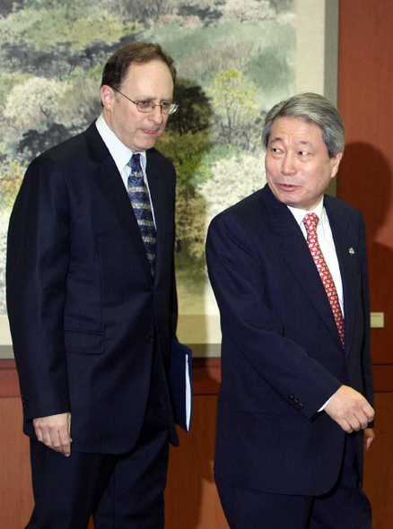유명환 외교통상부 장관이 3일 오후 서울 도렴동 외교통상부 청사에서 버시바우 주한미국대사와 미국 쇠고기 수입 중단 요청 문제를 논의하려고 함께 자리로 향하고 있다. 신소영 기자 viator@hani.co.kr