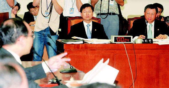 노회찬(왼쪽) 민주노동당 의원이 18일 국회 법사위에 출석한 김상희 법무차관(오른쪽 끝)에게 삼성에게 ‘떡값’을 받은 사실이 있는지 따져묻고 있다. 이종찬 기자 rhee@hani.co.kr