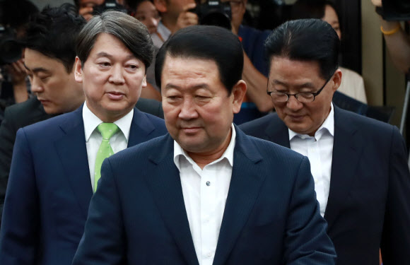 국민의당 안철수 전 대표(왼쪽)가 31일 오후 국회에서 열린 제2차 비대위-국회의원 연석회의에 박주선 비상대책위원장(가운데), 박지원 전 대표와 참석하고 있다. 연합뉴스