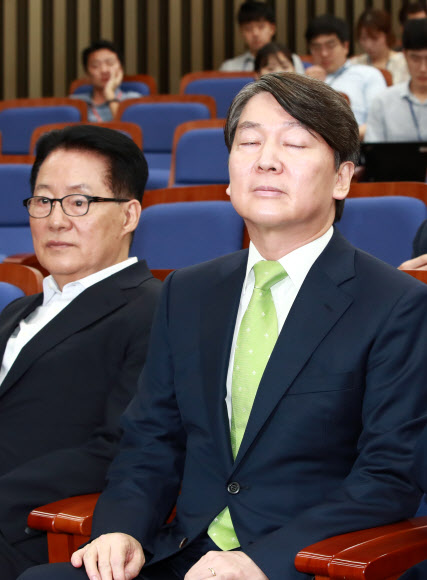 국민의당 안철수 전 대표(오른쪽)가 31일 오후 국회에서 열린 제2차 비대위-국회의원 연석회의에 참석해 눈을 감은 채 잠시 생각에 잠겨 있다. 연합뉴스