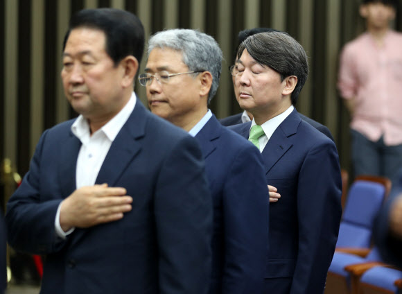 국민의당 안철수 전 대표가 31일 오후 국회에서 열린 제2차 비대위-국회의원 연석회의에 참석, 박주선 비대위원장, 김동철 원내대표와 함께 국기에 대한 경례를 하고 있다. 연합뉴스