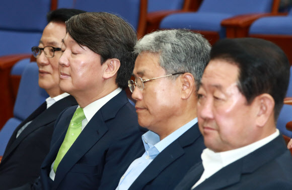 국민의당 안철수 전 대표(왼쪽 두번째)가 31일 오후 국회에서 열린 제2차 비대위-국회의원 연석회의에서 눈을 감은 채 생각에 잠겨 있다. 왼쪽부터 박지원 전 대표, 안 전 대표, 김동철 원내대표, 박주선 비대위원장. 연합뉴스