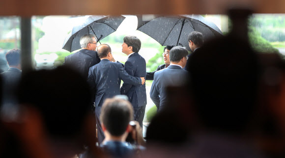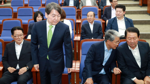 국민의당 안철수 전 대표(왼쪽 두번째)가 31일 오후 국회에서 열린 제2차 비대위-국회의원 연석회의에 참석해 자리로 향할 때 박주선 비상대책위원장(오른쪽)과 김동철 원내대표가 논의하고 있다. 연합뉴스