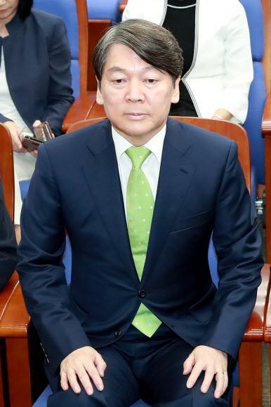 국민의당 안철수 전 대표가 31일 오후 국회에서 열린 제2차 비대위-국회의원 연석회의에 참석해 자리에 앉으며 숨을 깊게 들여 마시고 있다. 연합뉴스