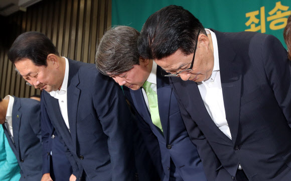 안철수 전 대표와 박주선 비대위원장 등 국민의당 의원들이 31일 오후 국회에서 열린 제2차 비대위-국회의원 연석회의를 마치며 19대 대선 ‘‘제보조작‘‘ 사건과 관련해 대국민 사과 인사를 하고 있다. 연합뉴스