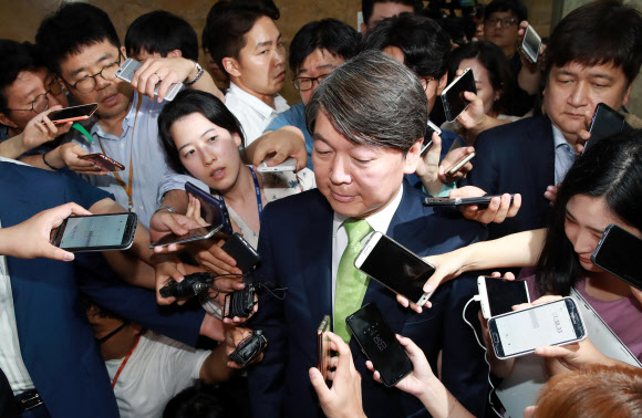 국민의당 안철수 전 대표가 31일 오후 국회에서 열린 제2차 비대위-국회의원 연석회의를 마치며 19대 대선 ‘‘제보조작‘‘ 사건과 관련해 대국민 사과를 마친 뒤 국회를 떠나며 취재진의 질문에 답하고 있다. 연합뉴스