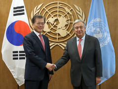 - 문재인 대통령은 18일(미국 동부 현지시간) 안토니우 구테흐스 유엔 사무총장에게 북핵문제를 비롯한 한반도 위기를 해결하기 위해 대화를 중재하기 위한 노력을 해달라고 요청했다.