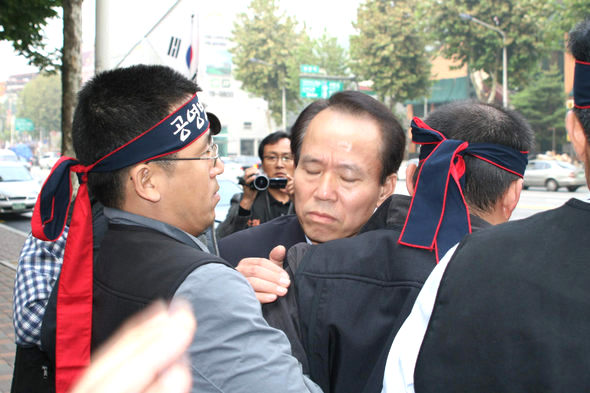 교육방송 노동조합 조합원들이 지난 9일 아침 출근을 하려는 구관서 사장(가운데)을 가로막고 있다. 사진 교육방송 노조 제공