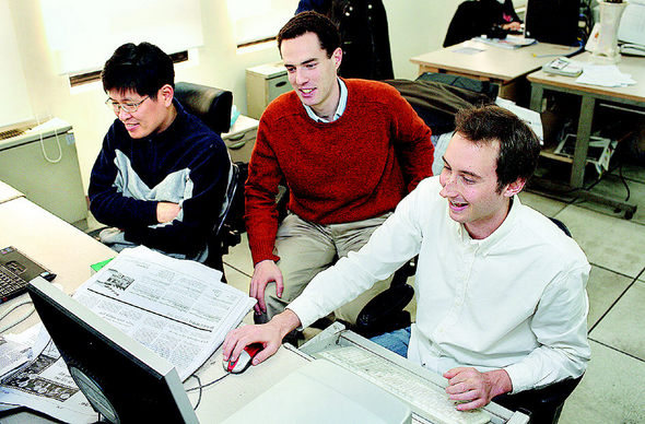 물건너온 미국청년 둘…‘한겨레’란 창 통해 세계에 한국 보여주기 <한겨레> 편집국에 두 미국 청년이 일하고 있다는 거 아세요? 제이슨 제어체크(28)와 대니얼 레이코브(26)입니다. <인터넷한겨레> 영문판(english.hani.co.kr)을 만들고 있지요. 지난해 5월 <한겨레> 식구가 됐습니다. 대니얼은 ‘마당발’이랍니다. 가입한 사내 동아리만 5개나 됩니다. 저를 보면 ‘박 선배’라며 살갑게 불러줍니다. 홍어도 즐겨 먹고, 사내 야유회 때 ‘화투’를 꺼내며 “기계 가져왔다”고 해서 동료들을 즐겁게 해주기도 합니다. ‘양다리 걸치기’ ‘썰렁하다’ 같은 말도 쓸 정도로 한국말에 능합니다. 대니얼은 미국에서도 인터넷으로 <한겨레>를 즐겨 읽었답니다. 프린스턴대에서 동양학을 공부했거든요. 전공은 한국과 일본의 근·현대사인데, 한국내 친일파 담론을 주제로 졸업논문을 썼습니다. 현재 미국 정부 장학생으로 고려대에서 유학하면서 동시에 <한겨레>에서 심층분석 기사나 기획기사와 같은 ‘깊이 있는’ 번역이 필요한 기사를 맡아 일하고 있습니다. 앞으로 미국 외교관으로 일하면서 ‘코미디언’으로도 활동하는 게 꿈이라고 하네요. 아, 대니얼은 한국 이름도 있어요. 유대성. 그래서 꼭 이렇게 인사합니다. “대니얼입니다. 한국 이름은 유대성이에요.” 제이슨은 가수 고 김광석을 좋아합니다. 미국 버클리대에서 영문학과 작곡을 복수전공했는데 취미 삼아 작곡도 합니다. 제이슨은 <한겨레>에서 뉴스 번역과 편집을 하면서 국제위기감시기구(International Crisis Group) 한국지부에서 인턴으로 일하고 있습니다. <한겨레>라는 창을 통해 세계인에게 한국을 보여주는 일에서 보람을 느낀다고 합니다. 한국 사회와 언론을 바라보는 눈이 정확하고, <한겨레> 식구들에게 한결같은 미소로 인사를 하는 인상 좋은 청년입니다.