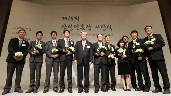 삼성언론상 시상식 삼성언론재단이 수여하는 제15회 상성언론상 시상식이 22일 오전 서울 프레스센터에서 열려 정창영 이사장(왼쪽 다섯번째) 이사장과 박종식(왼쪽 두번째) <한겨레> 사진기자 등 수상자들이 함께 했다.