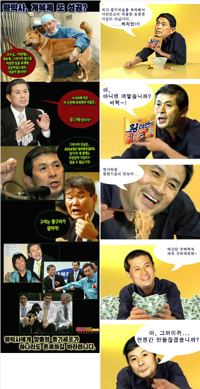 황 교수의 말을 비판하는 내용의 패러디들도 있다. 황 교수가 줄기세포에 대해 “한 개면 어떻고 세 개면 어떻습니까”라는 내용을 빗댄 만든 ‘황라면’이라는 패러디다. 이 패러디는 “제가 줄기세포를 복제해 사이언스에 제출한 논문은 사실은 아닙니다”라고 해놓은 뒤, “아 아니면 어떻습니까. 버럭~. 젓가락질 원천기술이 있는데”라고 표현해놨다. “수백억의 예산만 퍼부으면 그까이꺼 언젠가 만들 수 있다”고 황 교수의 얼굴에 말풍선을 달아놨다. 황교수의 곰팡이 발언을 비판하는 내용도 있다. 이 패러디는 책 디자인을 패러디로 만들었는데, 책 제목은 <그 많던 줄기는 누가 다 먹었을까>라고 표현해놨다. 책 설명에는 “2005년 팡이문화대상 수상작”이라며 “난자의 더미를 파헤친 곰팡내 풀풀 풍기는 황교주의 아프도록 아름다운 이야기”라고 해놨다. “황교수 소설로 그린 자화상, 유년의 기억”이란 설명도 덧붙여있다.
