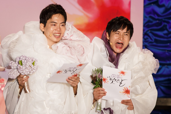 국내 첫 동성결혼식을 올린 김조광수 감독과 김승환 레인보우팩토리 대표가 7일 오후 서울 청계천 광통교 앞에서 열린 %!^a김조광수와 김승환의 당연한 결혼식, 어느 멋진 날%!^a에서 서로를 바라보고 있다. 2013.9.7 /뉴스1