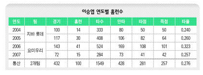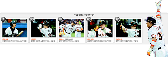 2004년 지바 롯데 유니폼을 입고 일본무대에 선 지 3년6개월, 432경기 출장 끝에 100호 홈런을 달성하는 순간이었다. 한국에서의 홈런을 합치면 통산 424개. 올 시즌 15호 홈런을 기록한 이승엽은 데뷔 첫해인 2004년 14개, 이듬해 30개로 상승세를 탔고, 요미우리로 이적한 작년엔 41개를 쳐내며 4번타자 자리를 굳혔었다. 하지만 올해 들어 어깨 부상과 컨디션 난조 등으로 고전하다 마침내 100호 홈런을 기록함으로써 한·일 프로야구사에 한 획을 긋게 됐다. 이승엽의 432경기 100홈런 페이스는 일본의 유명한 홈런타자인 오사다하루(563경기) 나가시마 시게오(504경기) 마쓰이 히데키(468경기)보다 모두 이른 것. 일본 프로무대 역대 250번째로 대기록에 이름을 올린 이승엽은 한국인 출신으로는 장훈(504개) 백인천(209개)에 이어 3번째.
