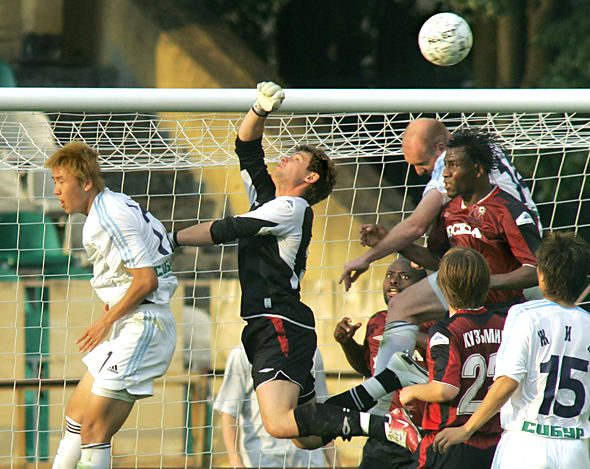 러시아 프로축구 제니트 상트 페테르부르크에 진출한 이호(왼쪽)가 20일(한국시각) CSKA모스크바와의 안방경기에서 문지기와 경합하며 헤딩슛을 시도하고 있다. 선발출전한 김동진(맨 오른쪽)도 문전에서 공격기회를 노리고 있다. 팀은 0-0으로 비겼으며, 딕 아드보카트 감독은 제니트 부임 뒤 3경기째 무승부를 기록했다. 제니트는 현재 16개팀 중 10위에 머물러 있다. 상트 페테르부르크/(AP, AFP, 로이터=연합)